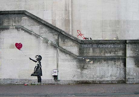 Crédit : Banksy, photo de Dominic Robinson, modifiée par Éric Sévigny, https://www.flickr.com/photos/dropstuff/2840632113/